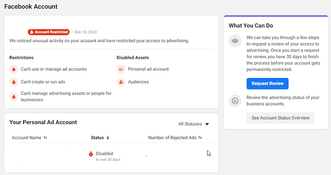 2.个人广告账户受限,仍可以查看广告账户,修改预算开关广告等,甚至有些时候可以更改受众(受限后,小的改动还是可以的);